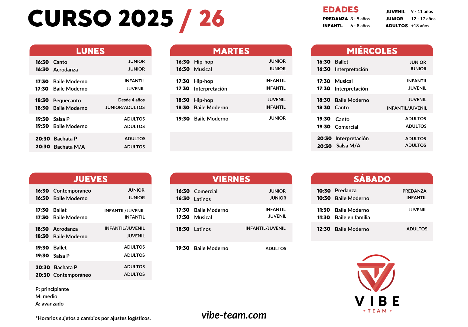 Horarios y Precios Actividades - ViBe Team
